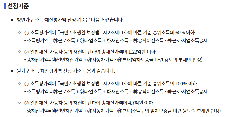 - 청년 본인 소득: 중위소득 60% 이하 (2024년 기준 약 126만 원 이하)자산 1억 2200만 원 이하